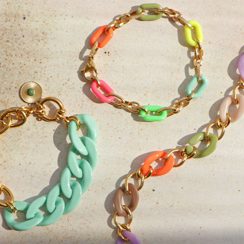 Diese neue Serie Acrylglieder lässt sich perfekt mit verschiedenen Jasseron-Gliedern kombinieren. Entwerfen Sie eine trendige Kollektion mit Armbändern und Halsketten, bei denen Sie Acrylglieder und Jasseron-Glieder zum Blickfang kombinieren. Die bunten Glieder lassen sich ganz einfach an Ohrringen wie Ohrsteckern oder Creolen befestigen. Verwenden Sie die Gliederketten auch für Handyketten und vergessen Sie nicht die Schraubnieten für Handyhüllen, die es Ihren Kunden einfach macht, Ihre Kette an ihren Handys zu befestigen.
