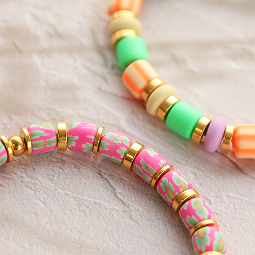 Diese Polymerperlen eignen sich hervorragend, um farbenfrohe Armbänder zu gestalten. Verwenden Sie elastisches Fädelmaterial, um darauf verschiedene Perlen zu fädeln. DQ-Metallperlen Discs z.B bieten zu den bunten Perlen einen interessanten Kontrast und Buchstabenperlen verleihen Individualität. Auch lassen sich verschiedene Anhänger zwischen den Perlen anbringen. Schließen Sie die Armbänder mit einem doppelten Knoten und verstärken Sie ihn mit Schmuckkleber