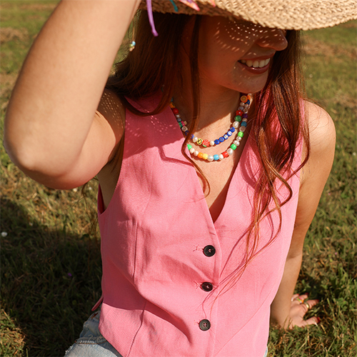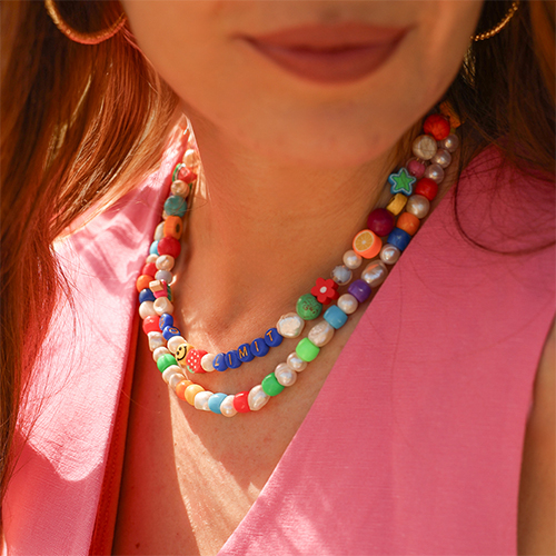 Hier eine exklusive Auswahl an Must-haves-Accessoires, die jedes Festival-Outfit perfekt ergänzen. Halsketten mit Acryl-(Buchstaben)-Perlen sind der absolute Hit dieser Saison. Kombiniert mit süßen Polymer-Früchtchen und die trendigen Keramik-Smileys verleihen sie jedem Outfit eine unwiderstehlich verspielte Note.