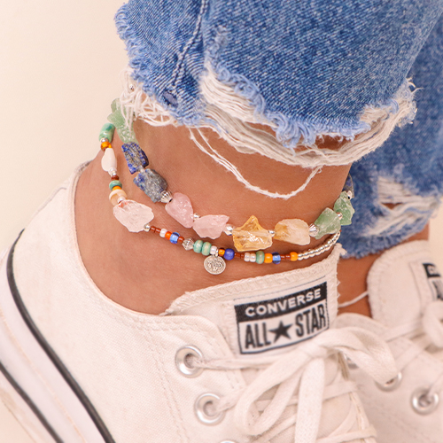Möchten Sie eine trendige Body Chain anfertigen? Verwenden Sie dann verschiedene Perlen wie Muschelkernperlen, Preciosa-Perlen und facettierte Perlen, die Sie zusammen mit den rauen Perlen aus Naturstein auf Makramee-Band auffädeln. Sie können auch zwei Ösen an verschiedenen Stellen anbringen, damit die Körperkette jedem passt. Kreieren Sie passende Fußkettchen mit Schmuckdraht oder Makramee-Band und einer Verlängerungskette. Verzieren Sie die Fußkettchen mit schönen Anhängern!