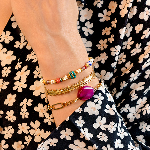Schmuck im Boho-Stil ist in diesem Frühjahr wieder angesagt! Sie können diesen Trend ganz einfach in Ihre Frühjahrskollektion einbinden, indem Sie natürliche Materialien wie Natursteinperlen für Ihre Schmuckdesigns verwenden. Für den Layering-Look bilden Halsketten in verschiedenen Längen und Armbänder aus grobem Jasseron mit verschiedenen Anhängern den Ausgangspunkt Ihrer Kollektion. Vervollständigen Sie Ihre Kollektion mit langen Ohrringen und einer trendigen Handyketten mit großen Perlen.