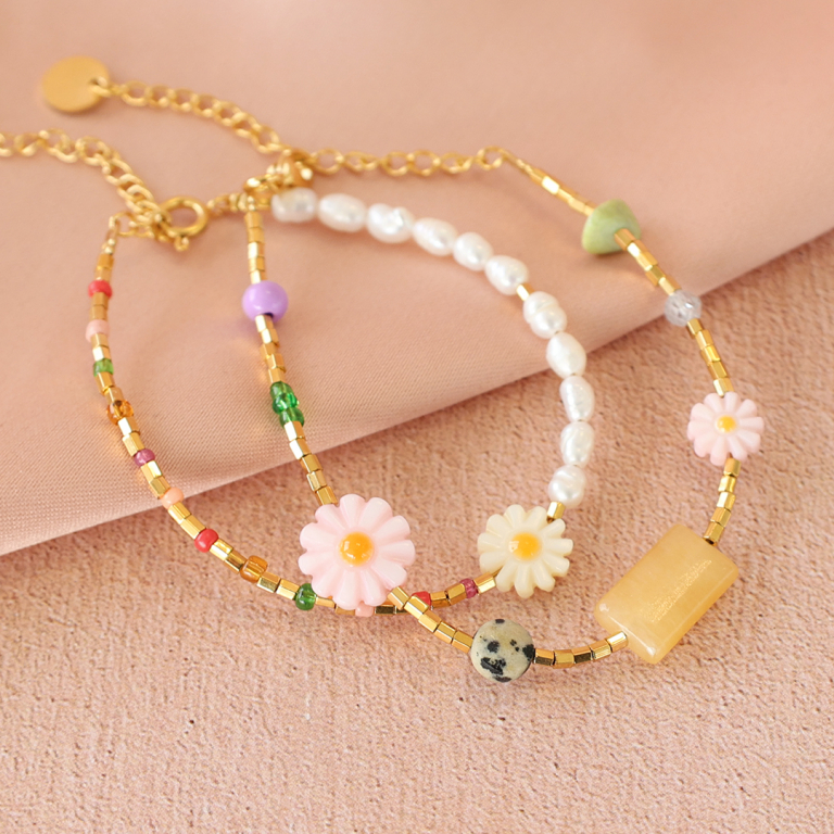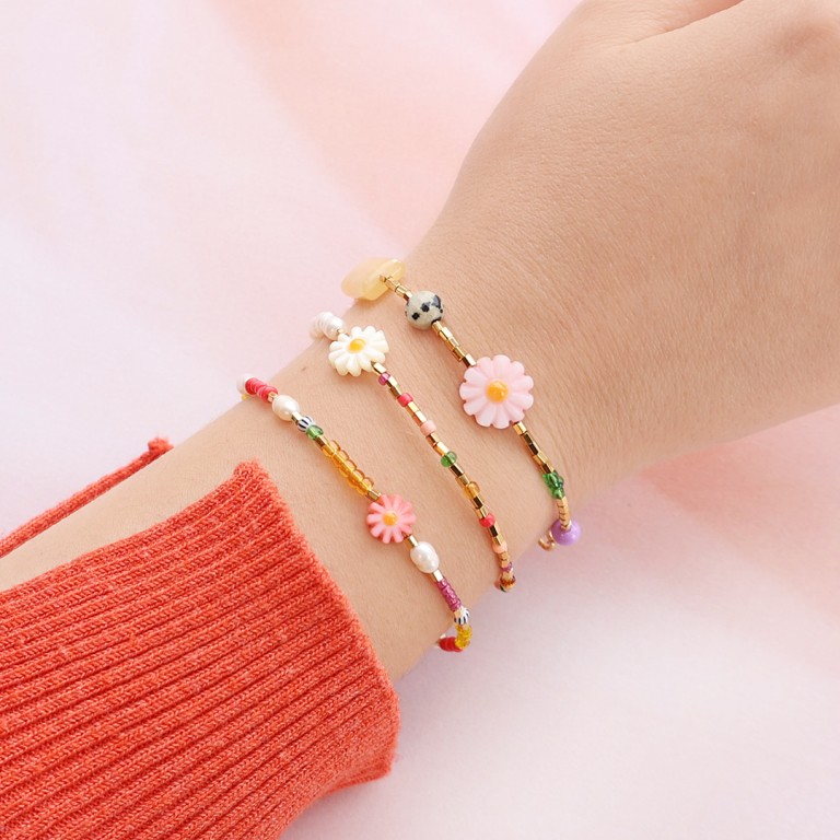 Kreieren Sie Schmuck im perfekten Sommerlook mit unseren wunderschönen Blumenperlen aus Perlmutt! Lassen Sie Ihrer Kreativität freien Lauf und gestalten Sie einzigartige Sets aus Armbändern und Halsketten. Verwenden Sie unsere hochwertigen Nietstifte in Kombination mit Jasseron, Miyuki Blumen, Rocailles, Natursteinperlen, Polaris und Miyuki Delica Tubes, um atemberaubende Anhänger zu kreieren, die Sie an Creolen hängen können.