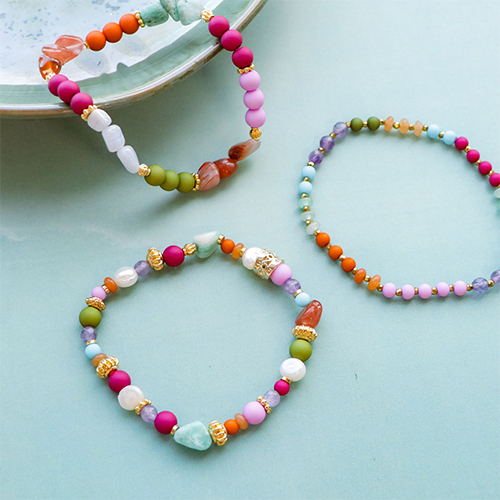 Mit Acrylperlen in Herbst- und Winterfarben eine neue Herbstkollektion erstellen. Mit elastischem Fädelgarn und verschiedenen Perlen lassen sich im Handumdrehen die verschiedensten Armbänder gestalten. Verwenden Sie Natursteinperlen, Tube-Acrylperlen, DQ-Metallperlen und Süßwasserperlen. Wählen Sie Perlen in passenden Farbtönen, um die Armbänder zu kombinieren. Fertigen Sie mit Makramee-Band und verschiedenen Perlen Handyketten und dazu noch farblich passende Schlüsselanhänger an.