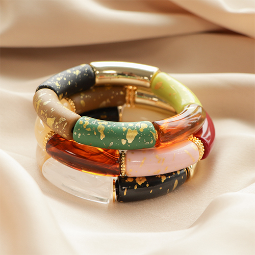 Trendige Armreifen sind leicht selbst zu machen und passen zu jedem Outfit! Fädeln Sie Tube-Perlen aus Acryl auf einen stabilen 1,2 mm starken elastischen Faden. Für einen besonders eleganten Look fädeln Sie 1 oder mehrere goldfarbene DC-Disc-Metallperlen zwischen die Tube-Perlen. Kreieren Sie mehrere Armbänder in passenden Farben, damit Sie die Armbänder als Set präsentieren können. Kombinieren Sie die Armbänder mit einem goldfarbenen Schlangenarmband aus Edelstahl.